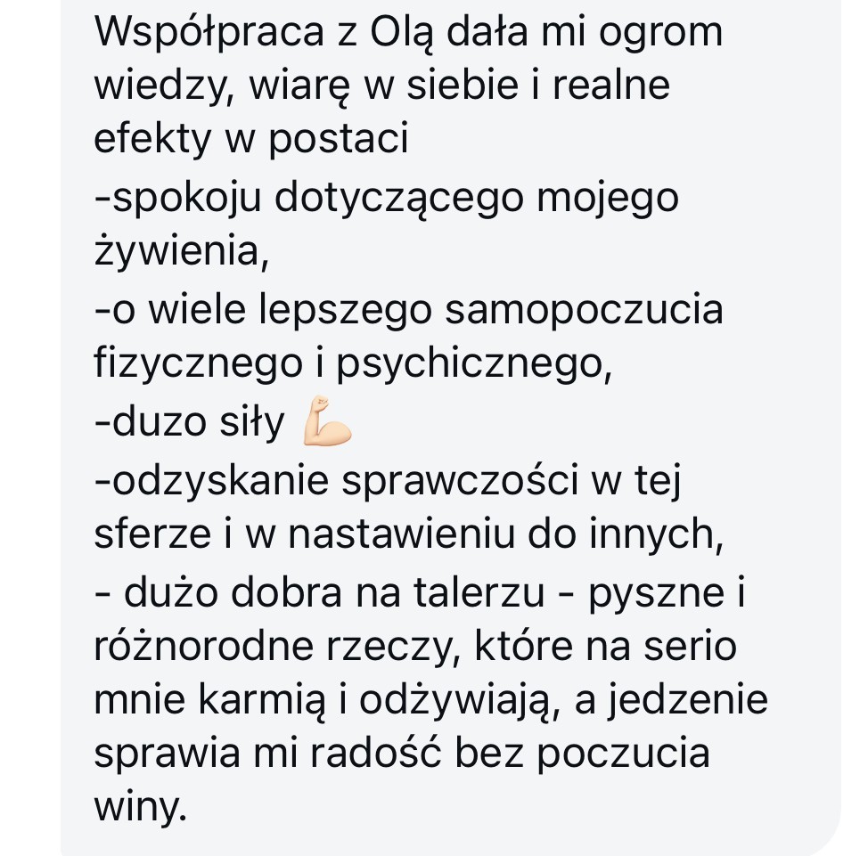 Nie jesteś tu po to, żeby wcisnąć się znowu w stare spodnie. Jesteś tu po to, żeby się z nich uwolnić. Twoje ciało może się zmienić – delikatnie w górę, delikatnie w dół albo… nie zmienić się wcale. To nie jest efekt uboczny – to część procesu. Jeśli Twoje priorytety to luz w głowie, na talerzu, nauczenie się odżywiania – jestem tu i zapewniam, że żadna część programu nie jest stworzona po to, by wpływać na Twoją wagę.