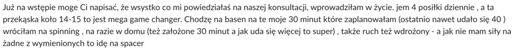 Jeśli uznasz po naszym programie, że chcesz do niego wrócić, bo Ci pomaga – noł problemo. Ale na czas naszej współpracy potrzebujesz innego narzędzia, które pomoże Ci zobaczyć, co się dzieje w Tobie, a nie tylko na wadze i w gramach zjedzonego białka. Bez obaw, nie zostawiam Cię z tym samą – dam Ci nowy kierunek, podpowiedzi, wskazówki.